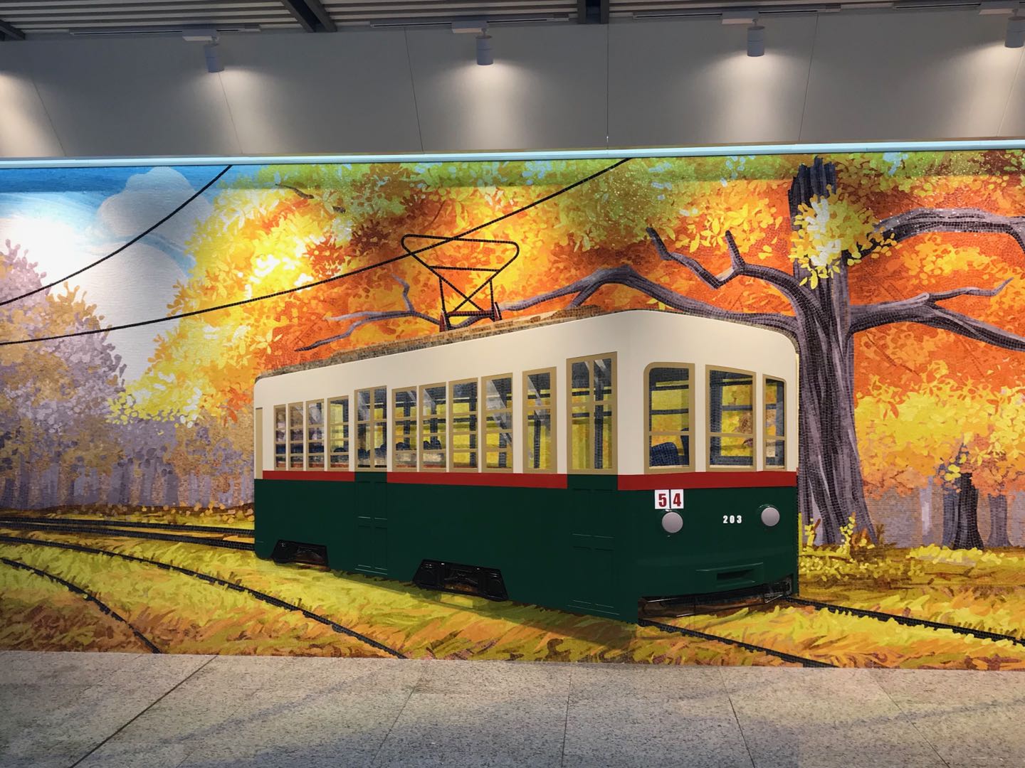 作為重要的工業基地和交通樞紐,長春是中國最早應用有軌電車的城市之一。來來往往的電車是很多長春人記憶中最熟悉的畫面。這件作品采用開放式構圖,配合地鋪裝飾,用拼貼手法表現了在富有懷舊氣息的金秋時節,電車在落葉中徐徐駛來的場景,打造出身臨其境的全景式視覺體驗。“有軌電車”也呼應了“地鐵” 場景,新舊今昔對比中,既能觸動市民心底的美好記憶,又能展現城市交通的巨大發展。