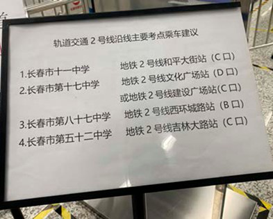 為保障參加2020年高考的考生順利參加考試,今年高考期間運營事業總部各客運中心推出一系列措施,保障考生準時到達考場,安心考試。軌道交通1號線各車站共計為考生共提供鉛筆、橡皮、等考試用品,沿線九座客流大站均為考生提供站內過街通道及考生綠色通道的服務。為方便考生及家長,各站在還安檢點設置沿線主要考點乘車建議牌,保證考生順利參加考試。